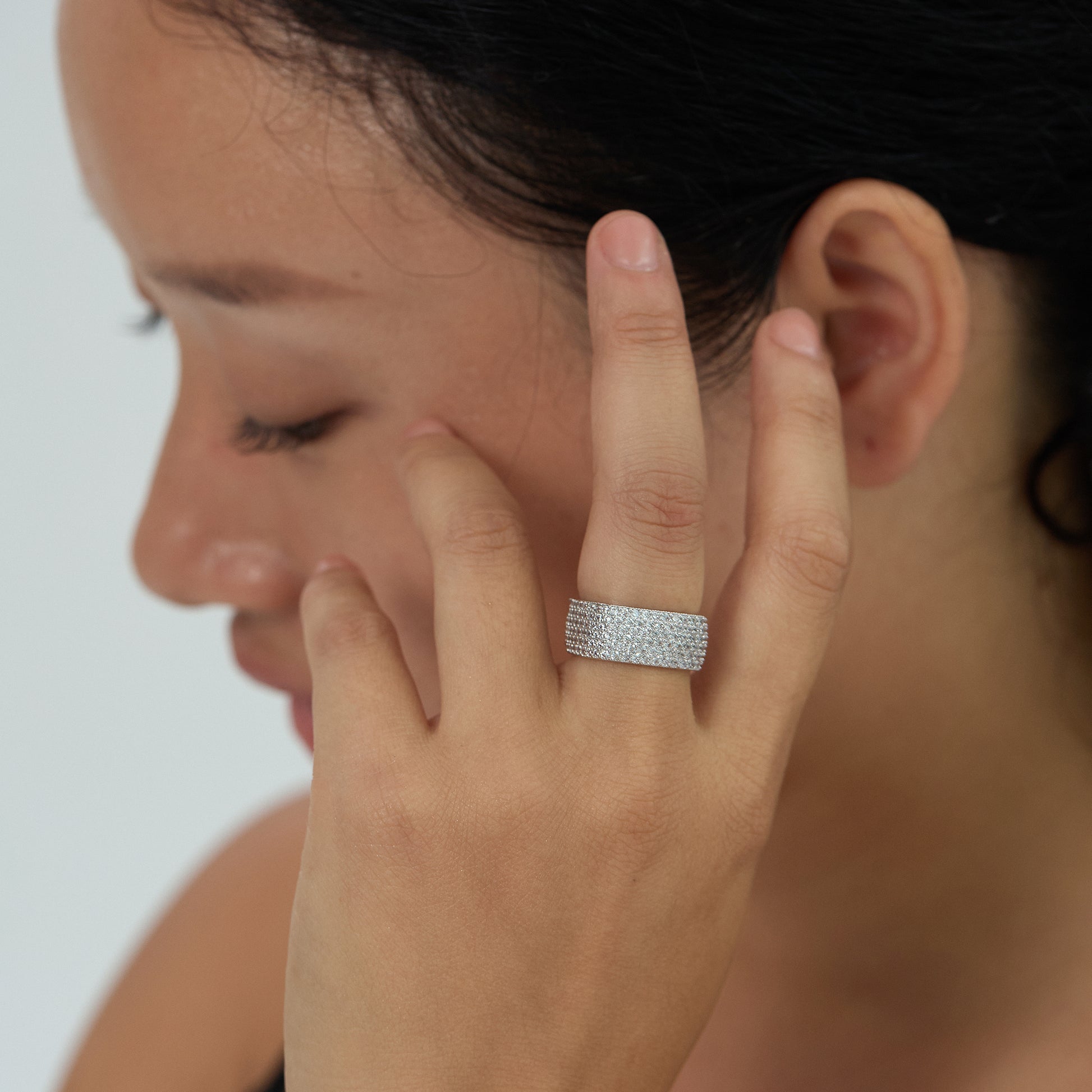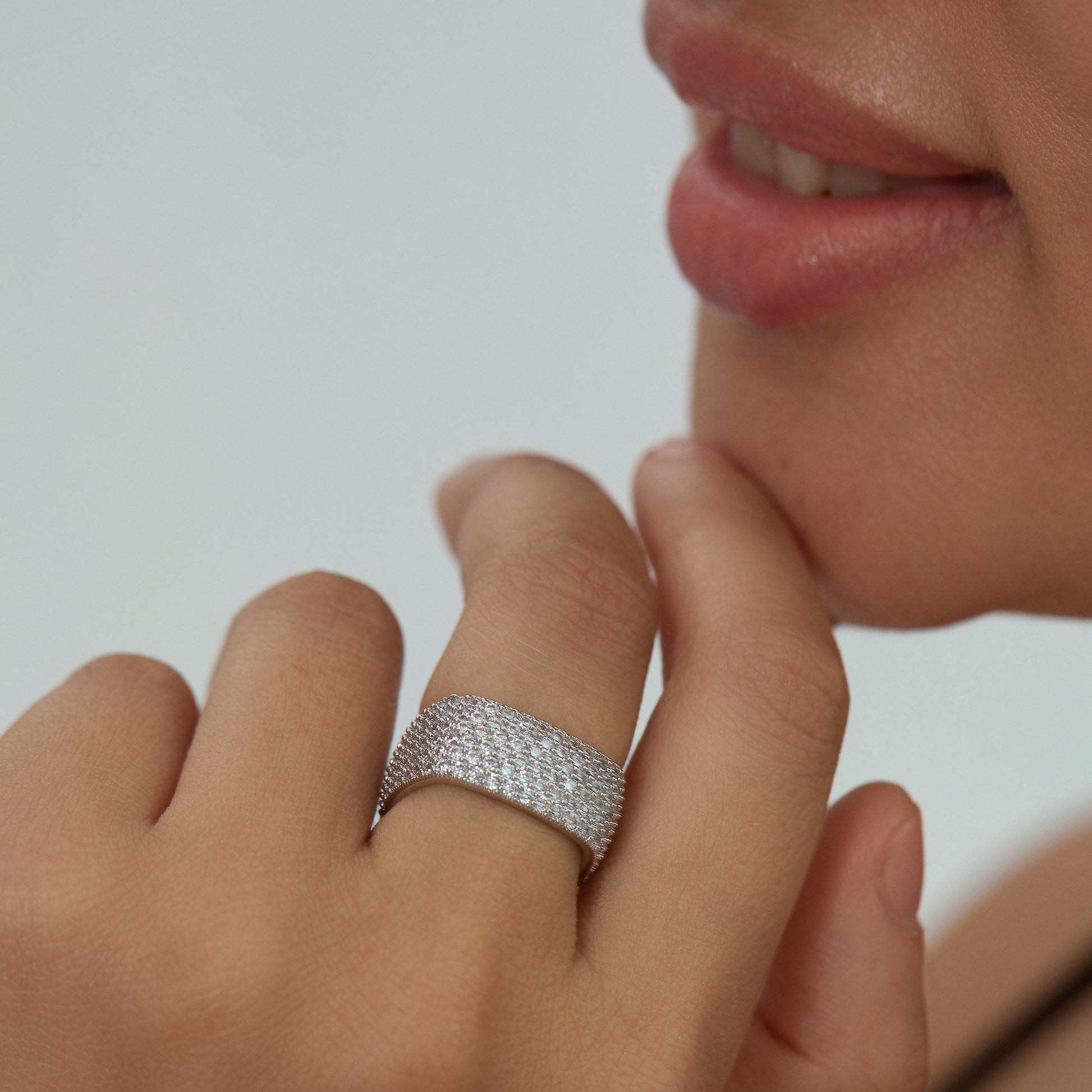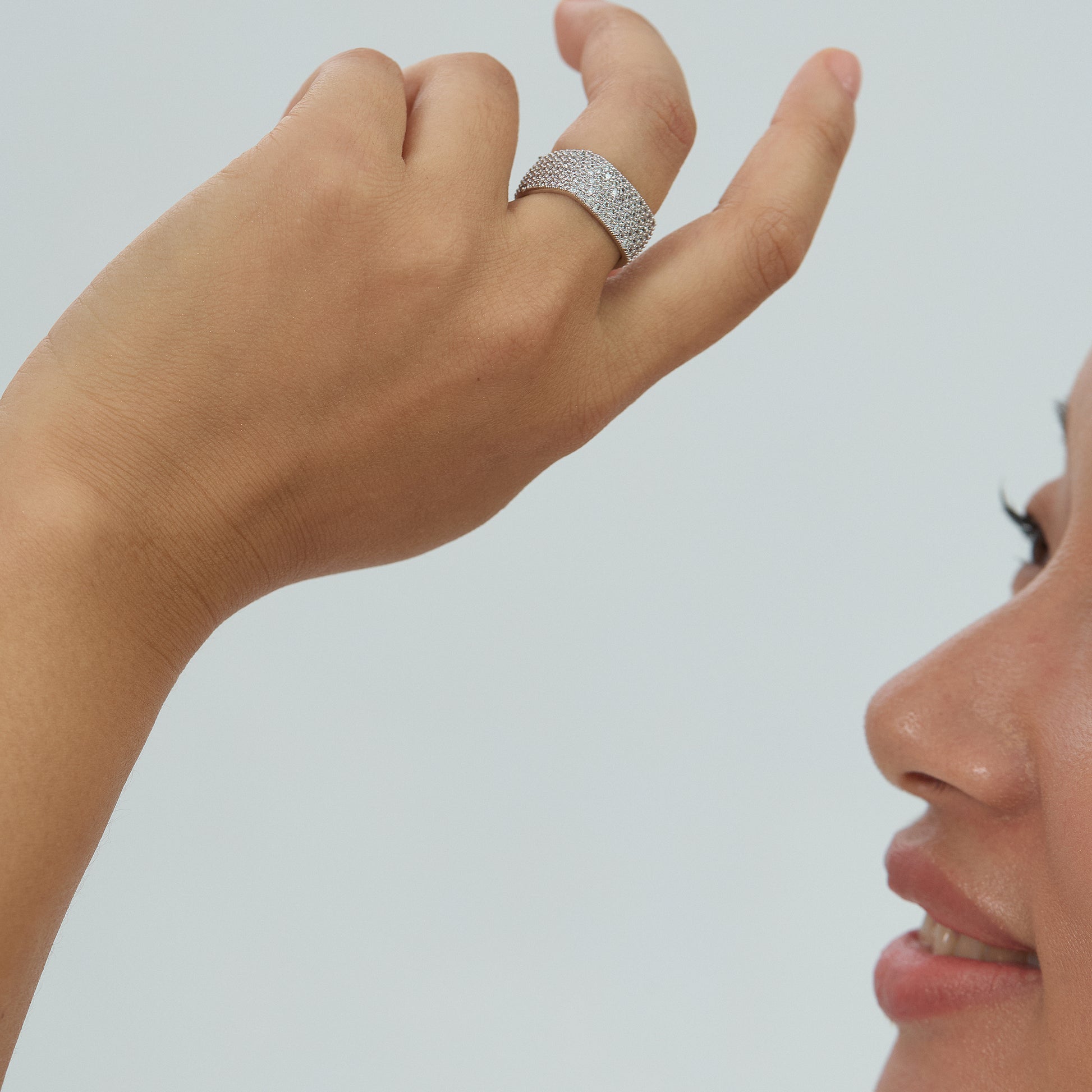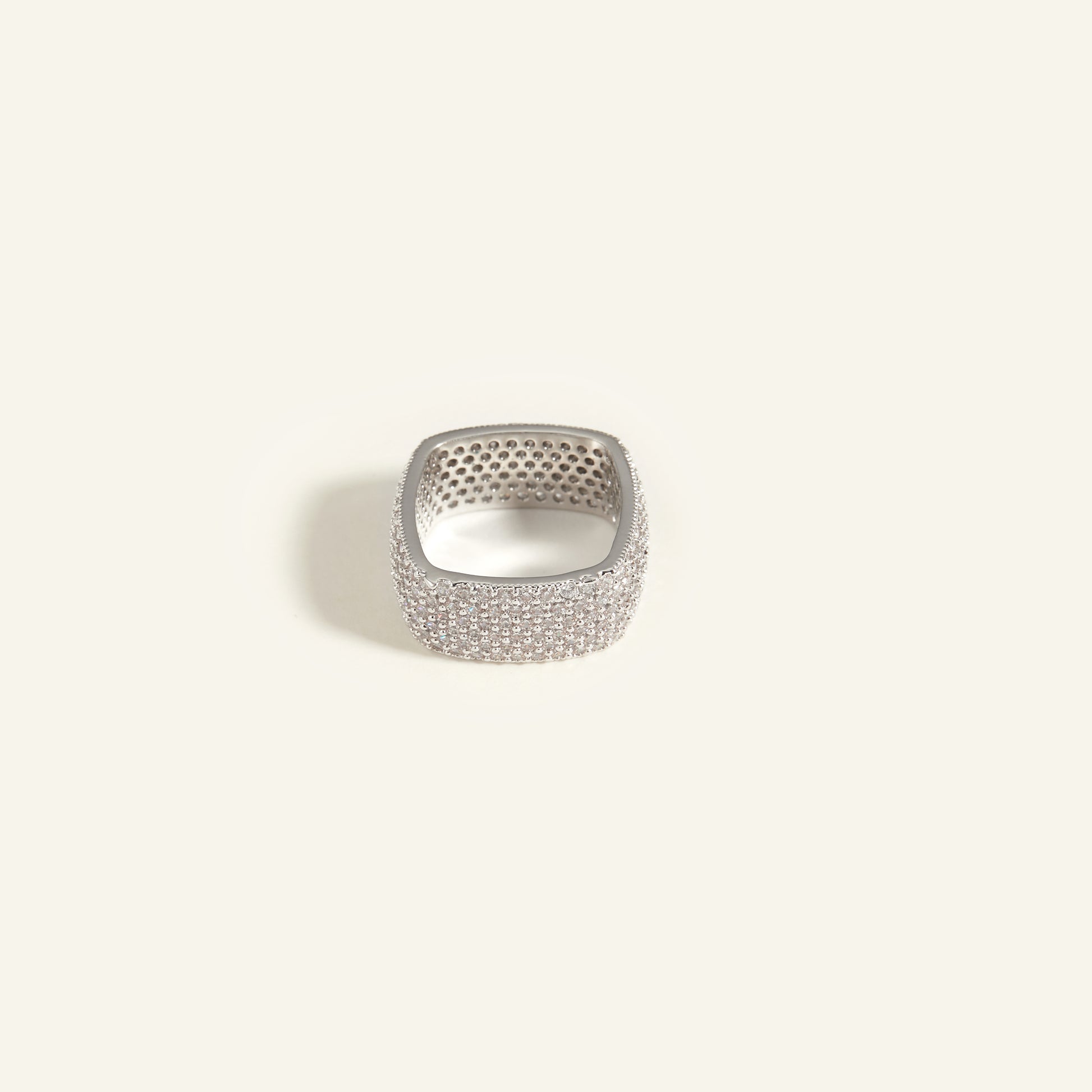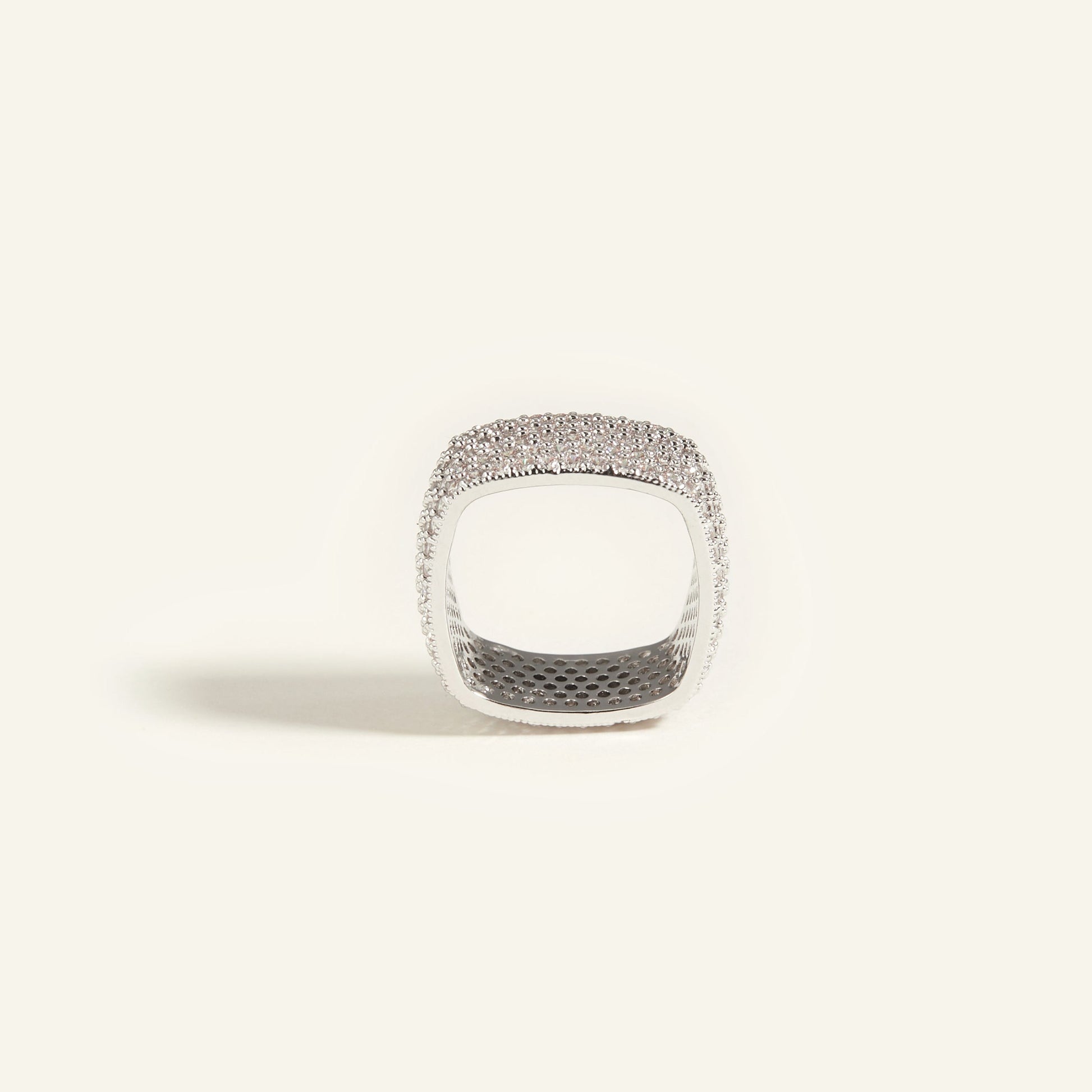 The Lumen Edge Ring combines bold geometric shape with radiant sparkle, making a statement of modern elegance and resilience. Fully encrusted with shimmering pavé crystals, its squared silhouette evokes contemporary architecture, while its brilliance captures city lights—powerful, poised, and alive.