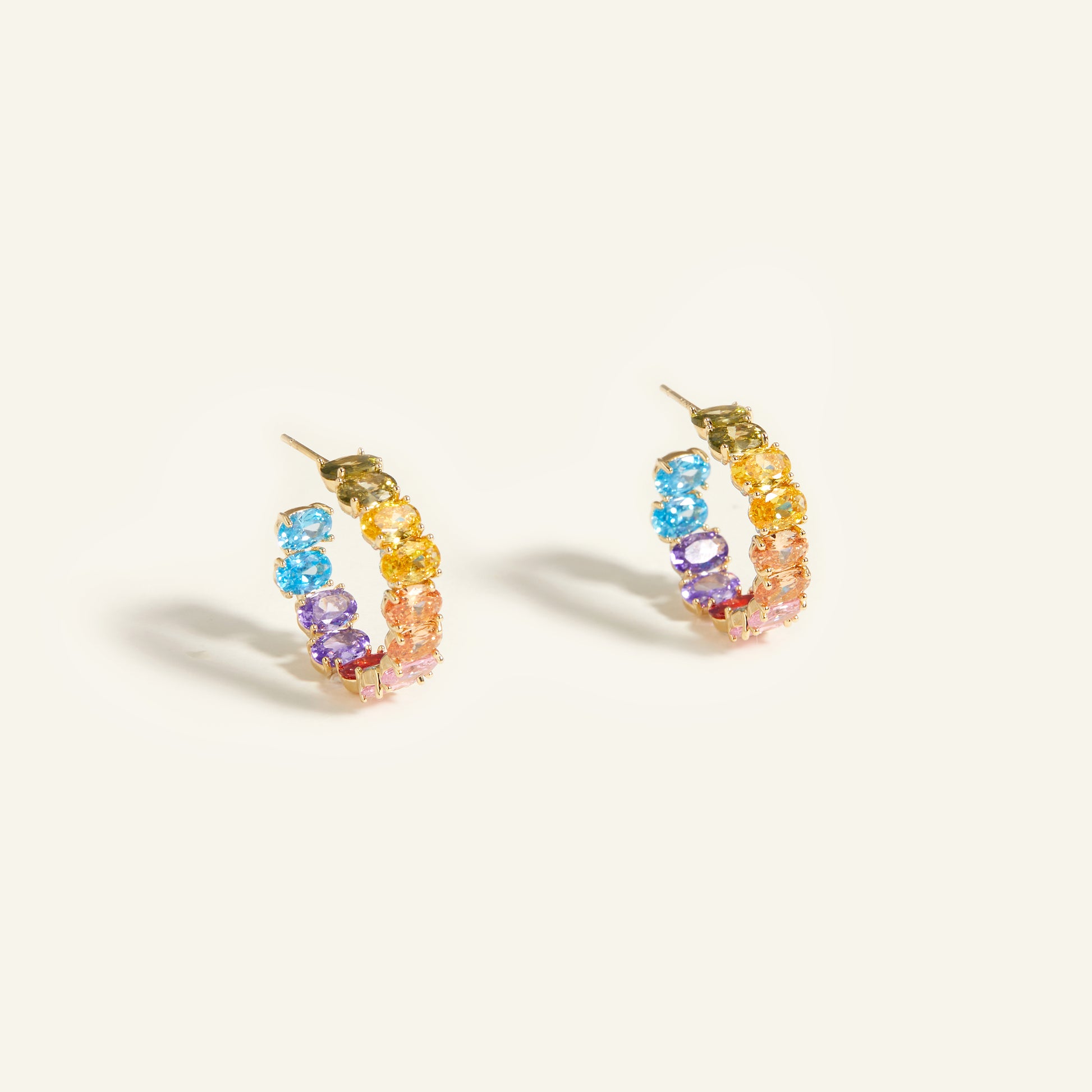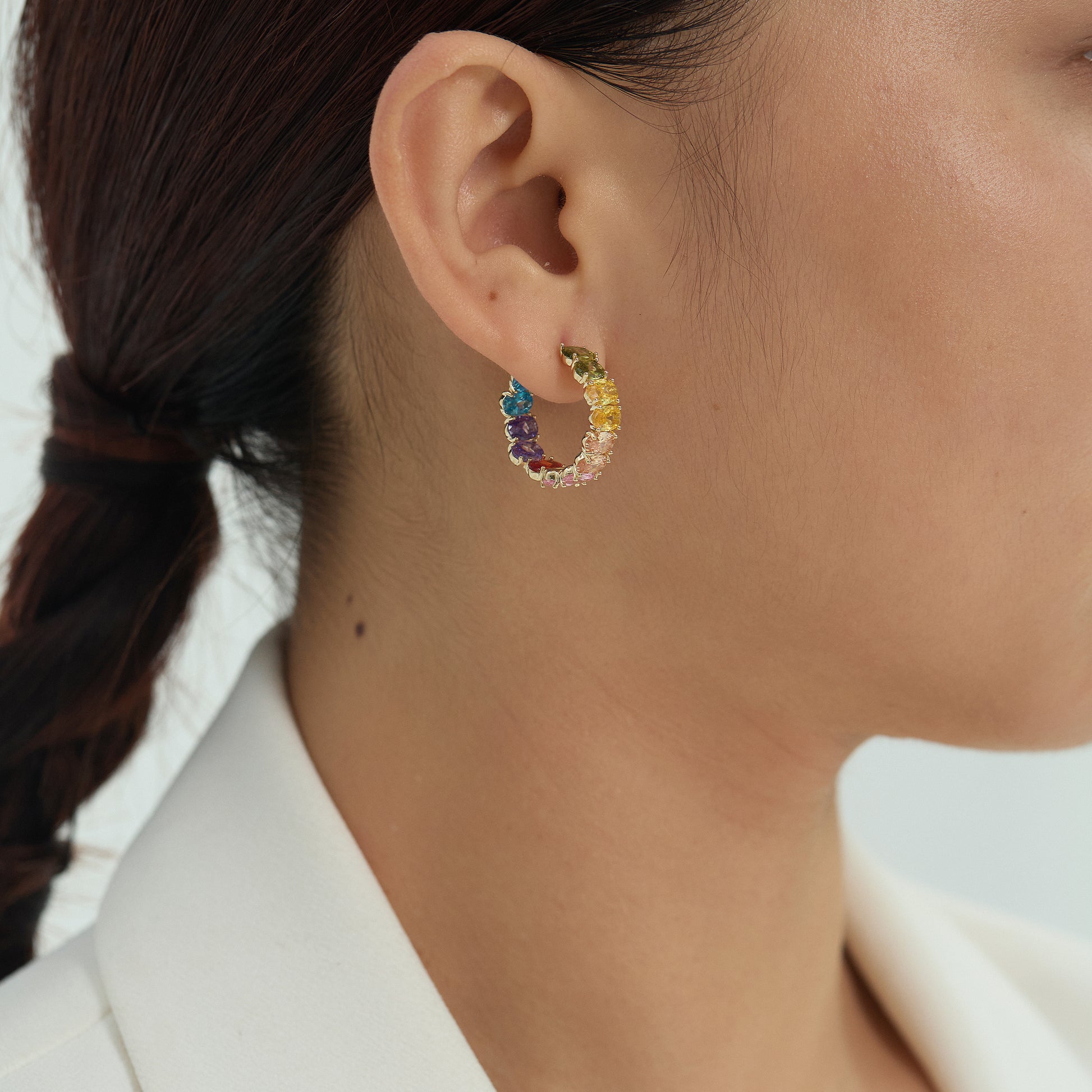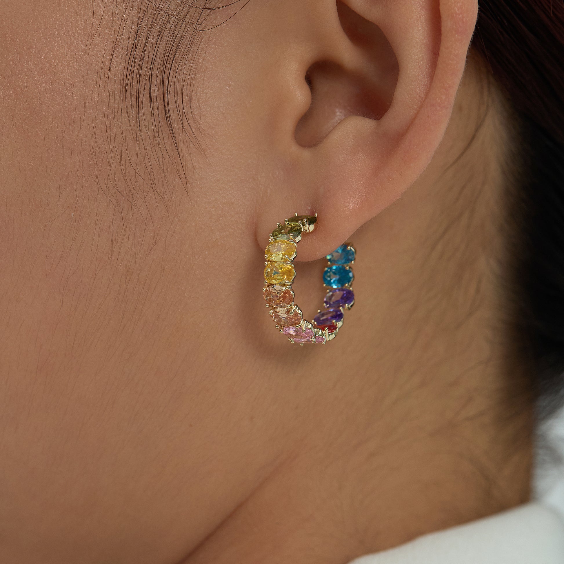 Six-color Rainbow will redefine the colors of the rainbow. Blue symbolizes the ocean - serenity, purple symbolizes grapes - longing, red symbolizes red dresses - sexiness, flesh color symbolizes skin - authenticity, yellow symbolizes wine glasses - passion, and green symbolizes gardens - freshness. The owner has discovered them in every detail of daily life. And perceptual associations were made to endow them with unique meanings. Rainbow crystals of different tones were made and placed on the earrings, creating a curved amplitude like a rainbow, hoping that anyone wearing them would smile like a rainbow.