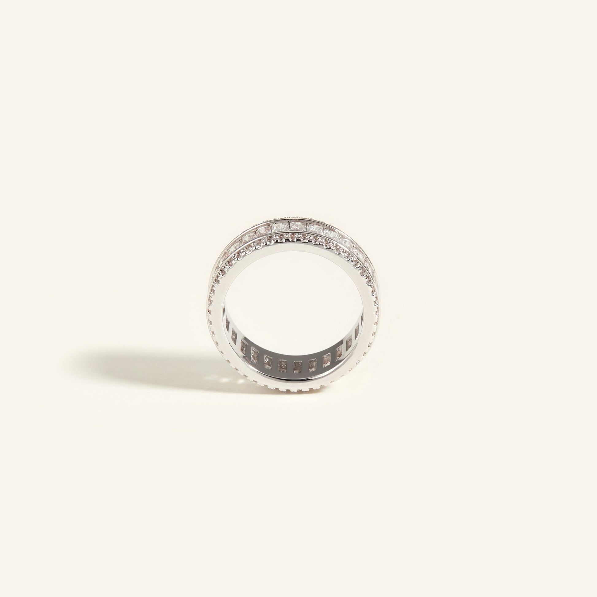 A symbol of clarity and strength, the Lumen Ring features a wide, mirror-like silver band with intricate double-row pavé crystals, radiating modern sophistication and quiet power. Its sleek, structured silhouette embodies luminous restraint, designed for those who move with intention.